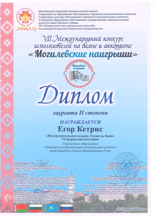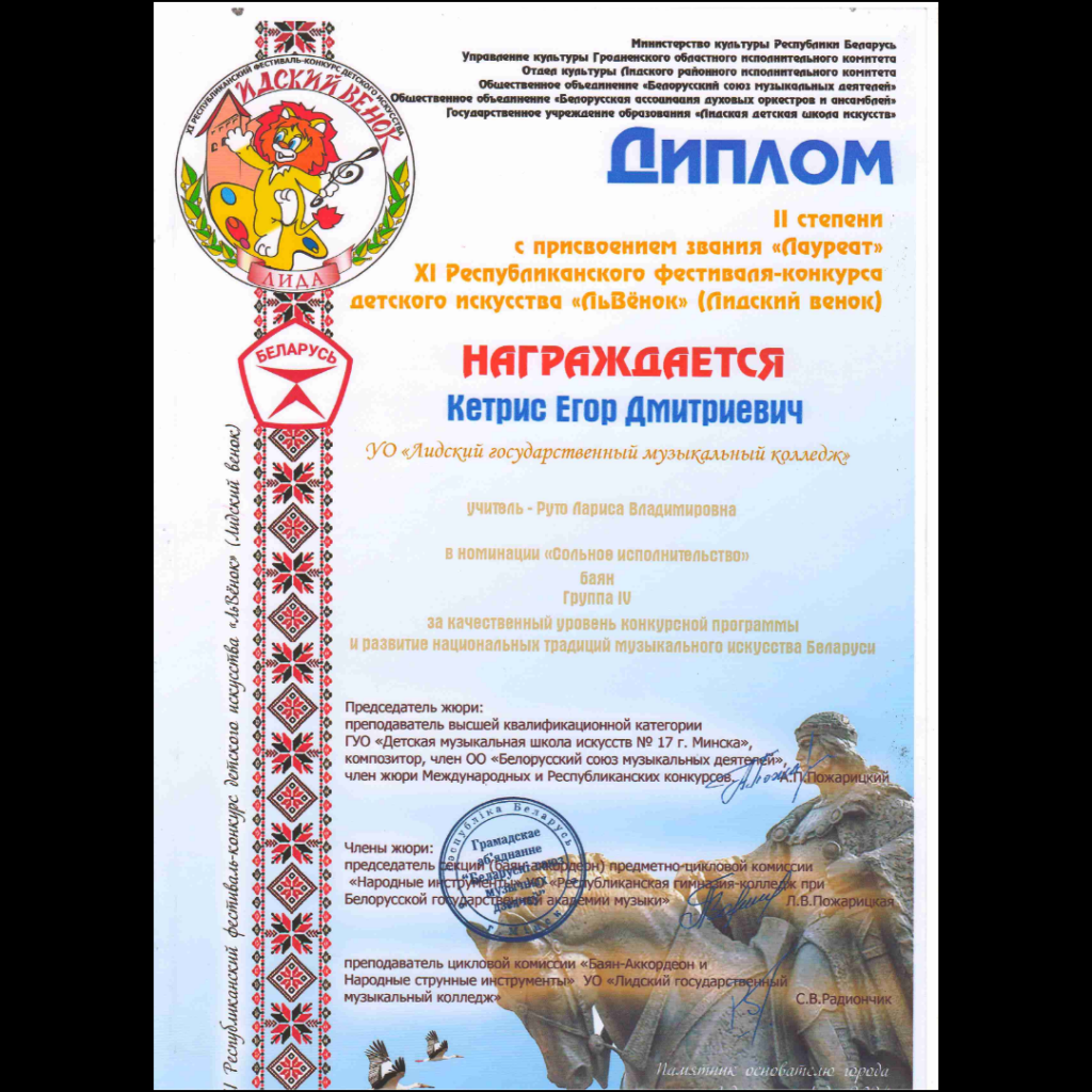 Кетрис Егор Дмитриевич обучается в учреждении образования «Лидский государственный музыкальный колледж» по специальности «Инструментальное исполнительство (инструменты народного оркестра)» с 2023 г. /класс преподавателя Руто Ларисы Владимировны/.
