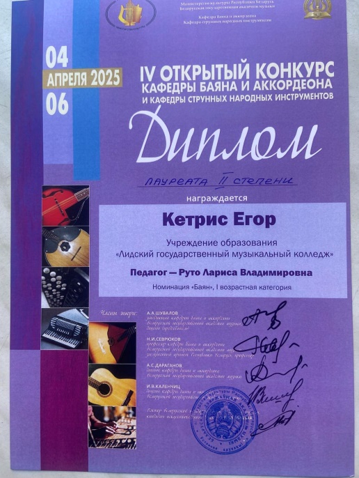 Лауреата ІІ степени IV Открытого конкурса кафедры баяна и аккордеона и кафедры струнных народных инструментов УО «Белорусская государственная академия музыки», г.Минск, 2025.