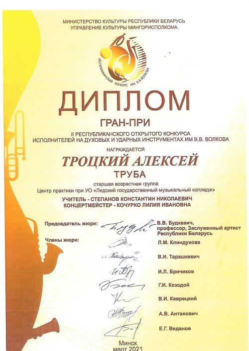 Троцкий Алексей Мечиславович обучается в учреждении образования «Лидский государственный музыкальный колледж» по направлению специальности «Инструментальное исполнительство (оркестровые духовые и ударные инструменты)» с 2021 г. /класс преподавателя Степанова Константина Николаевича/.