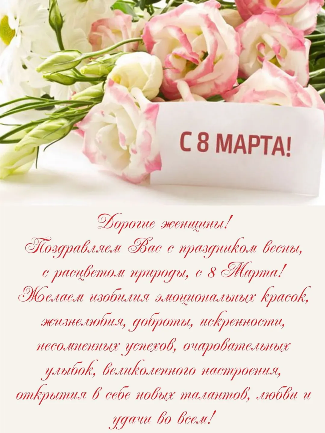 Пусть этот весенний праздник — 8 Марта — принесёт тепло, радость, море улыбок и приятных сюрпризов! Желаем вам вдохновения, любви, здоровья, благополучия! Оставайтесь такими же прекрасными, яркими и целеустремленными, а весна пусть подарит новые возможности для исполнения заветных желаний!