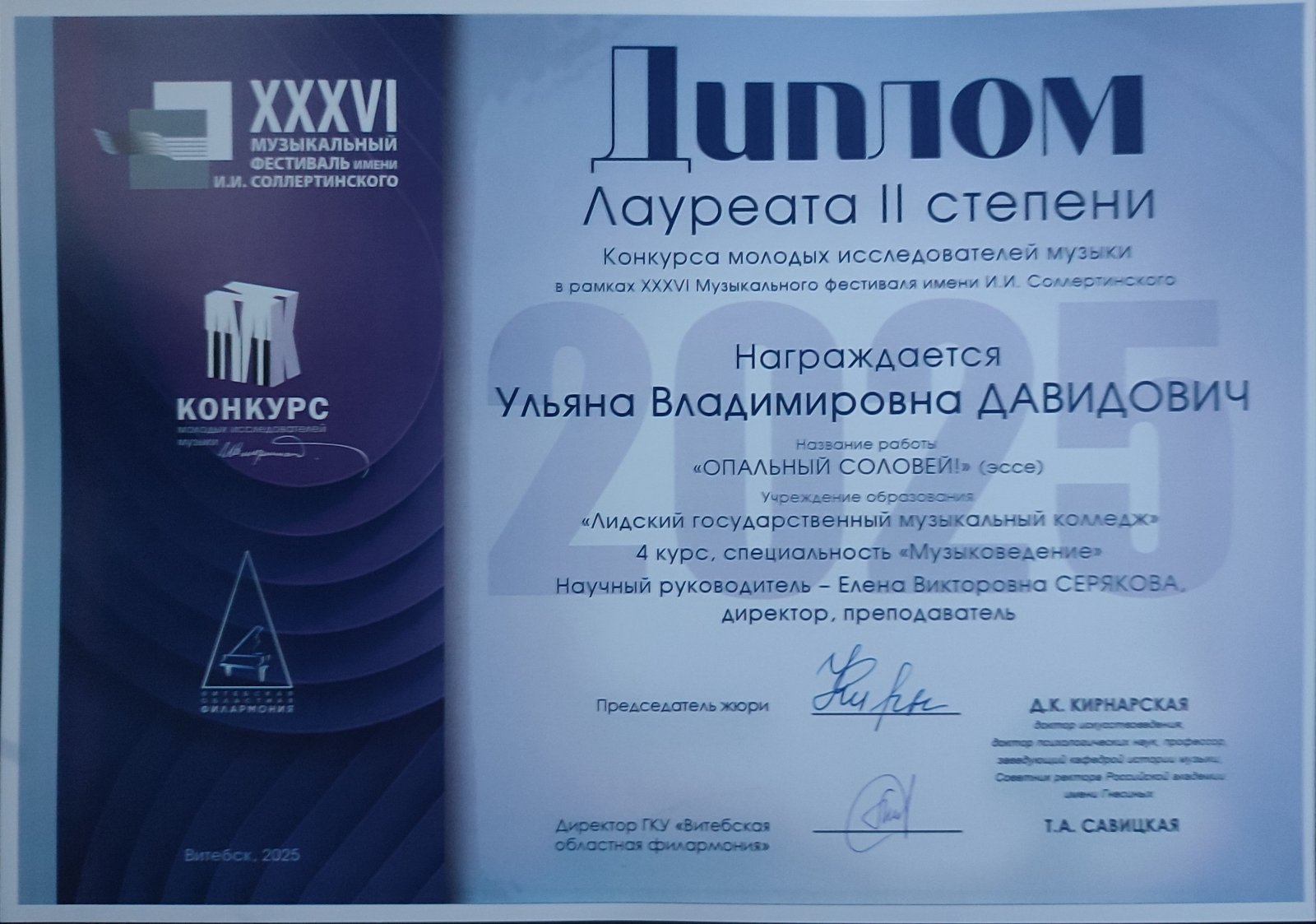 Давидович Ульяну (преподаватель Серякова Елена Викторовна) с дипломом лауреата ІІ степени Конкурса молодых исследователей музыки в рамках XXXVI Музыкального фестиваля имени И.И. Соллертинского