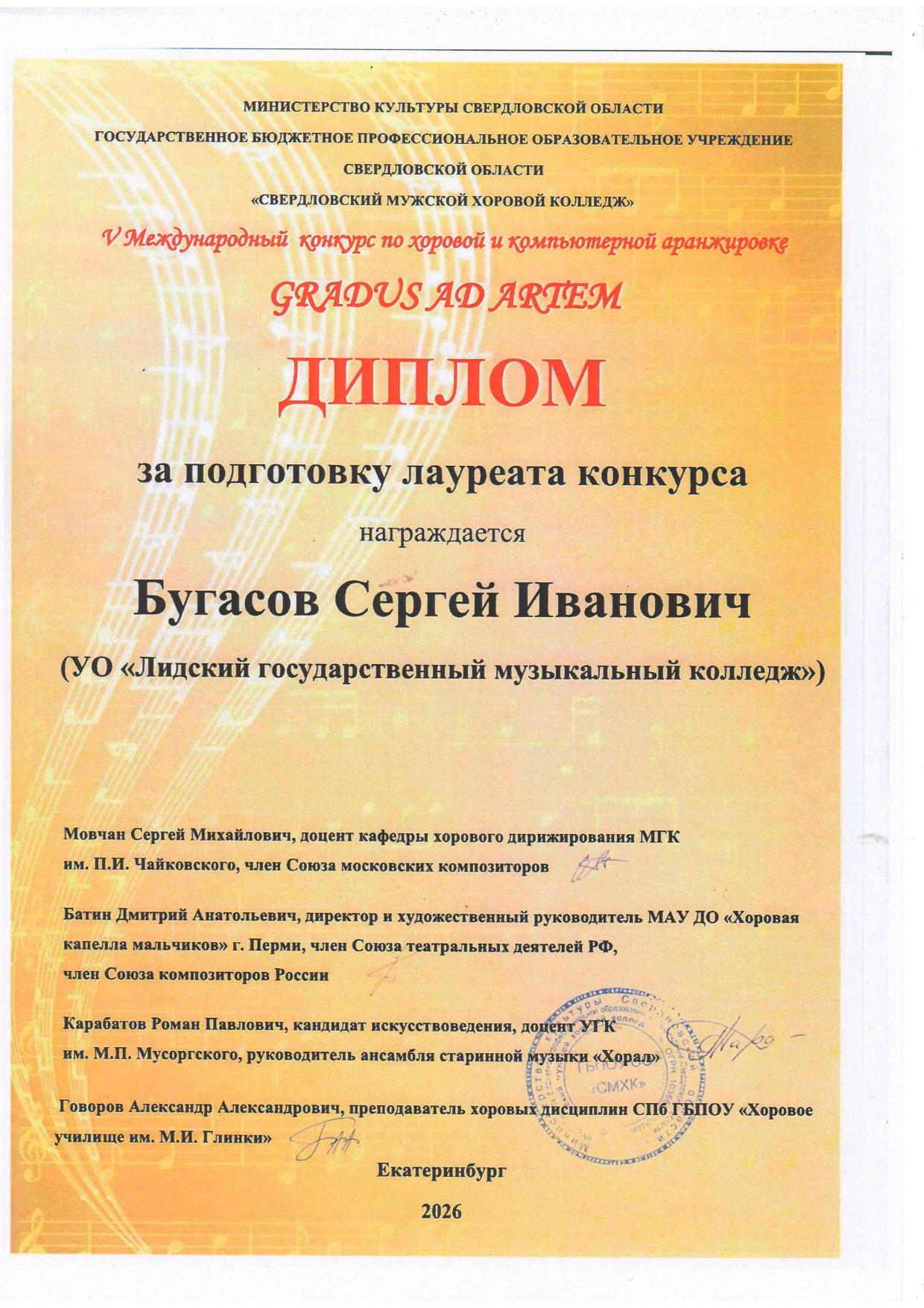 Ненартовича Леонарда (преподаватель Бугасов Сергей Иванович) с дипломом Лауреата II степени V Международного конкурса по хоровой и компьютерной аранжировке Gradusadartem (Екатеринбург, РФ)