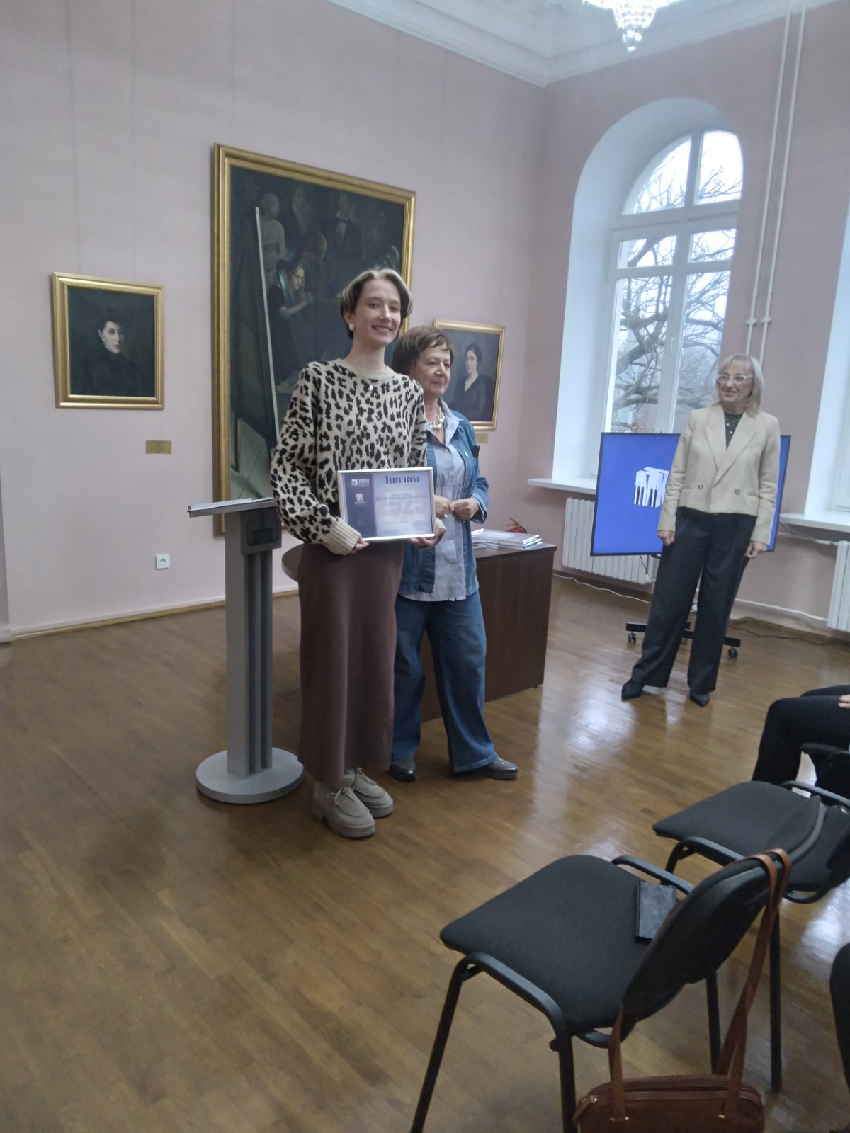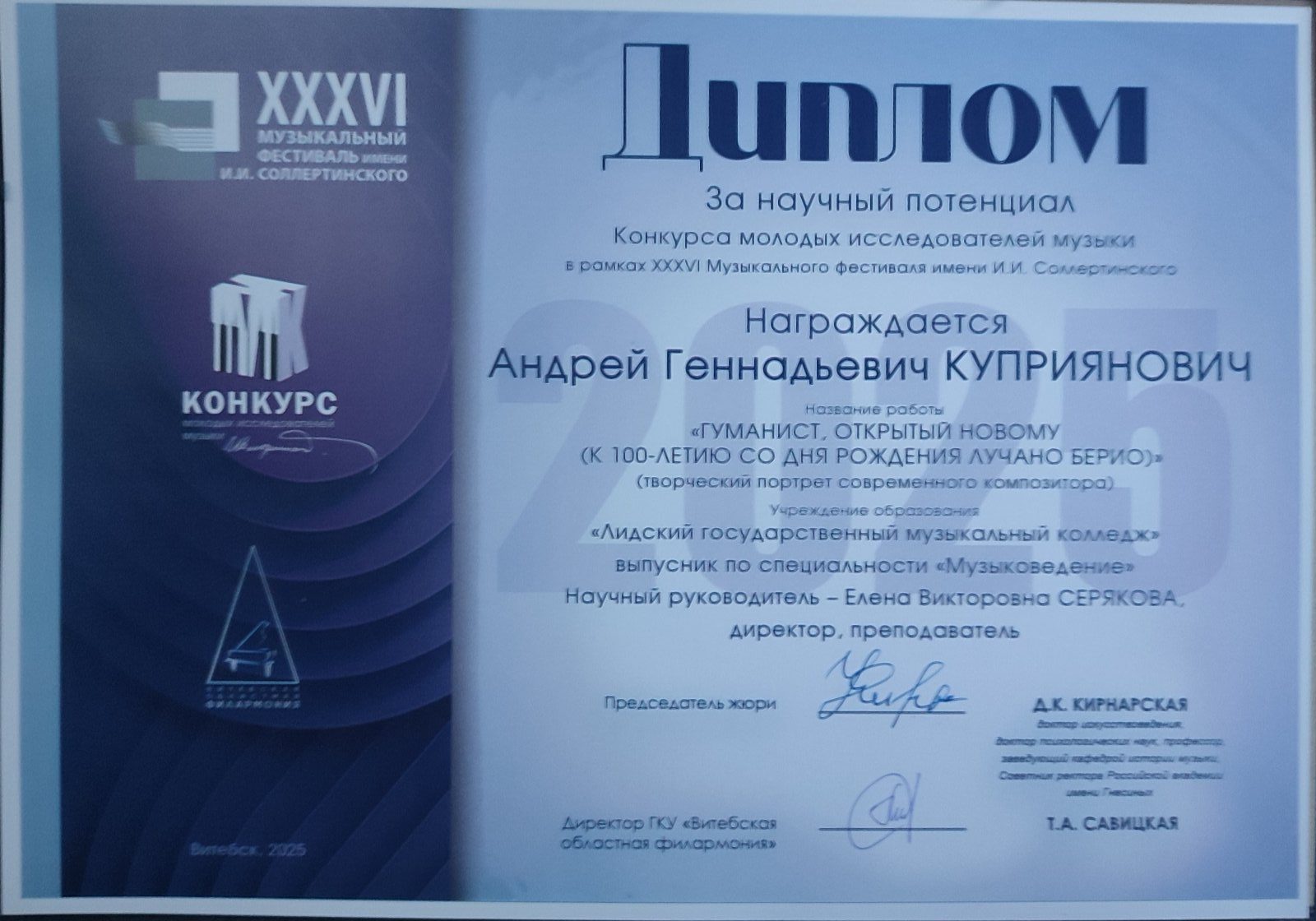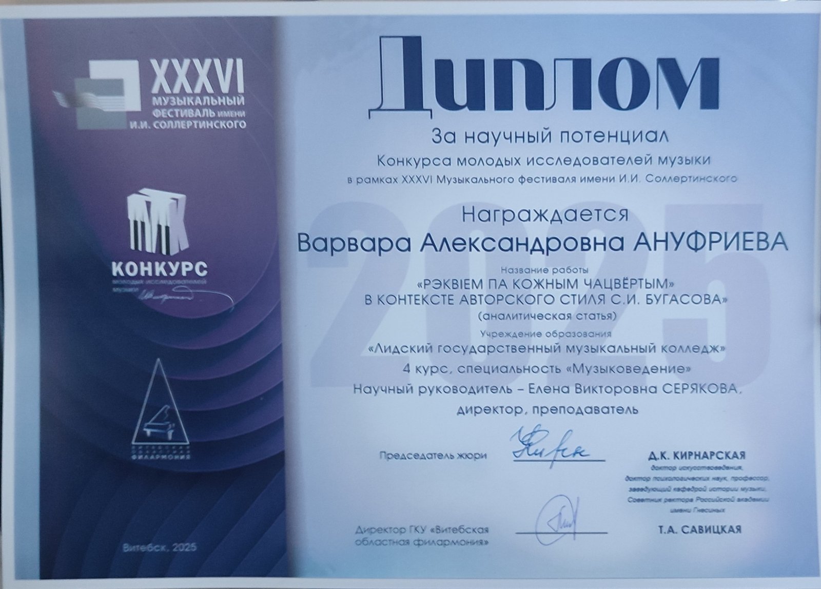 Церемония награждения победителей состоялась на открытии Научных чтений, организованных Витебской областной филармонией и Белорусской государственной академией музыки. По решению жюри диплом 1ой степени не вручался, в связи с чем поздравляем учащуюся Ульяну Давидович и преподавателя, директора Елену Викторовну Серякову с дипломом 2ой степени, а также выпускников колледжа Варвару Ануфриеву и Андрея Куприяновича/преподаватель Елена Викторовна Серякова /с дипломами «За научный потенциал»!!!