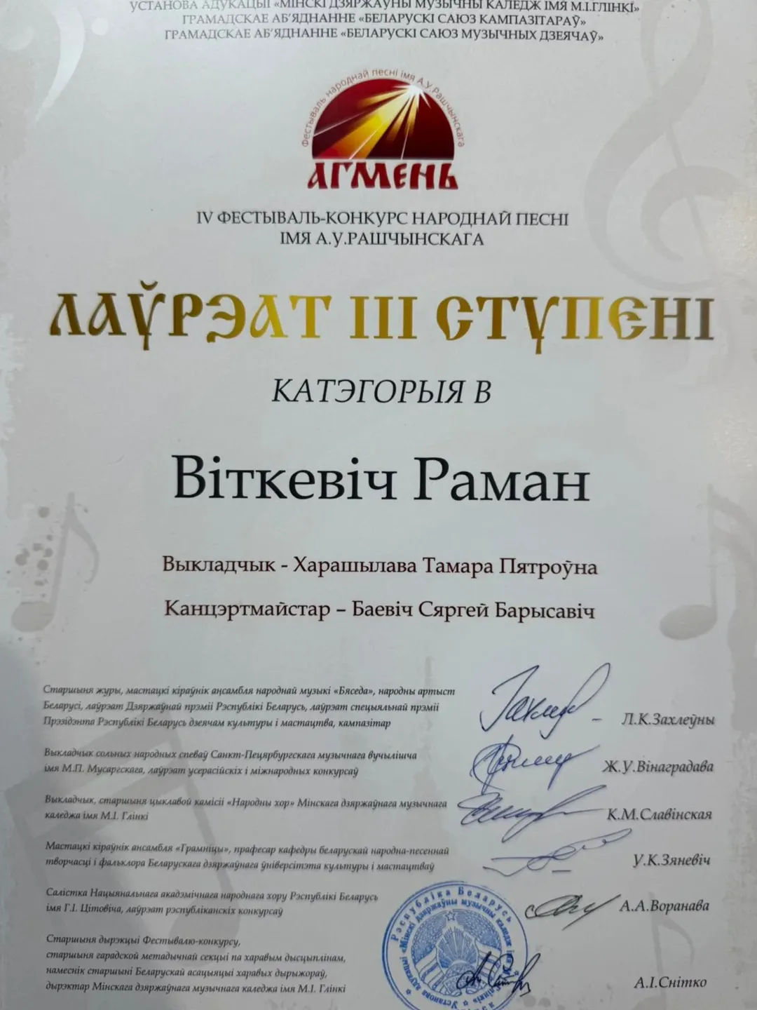 Учашегося 4 курса цикловой комиссии «Хоровое исполнительство» учреждения образования «Лидский государственный музыкальный колледж» РОМАНА ВИТКЕВИЧА с дипломом лауреата III степени IV фестиваля-конкурса народной песни им. А.В.Ращинского «Агмень», преподаватель ХОРОШИЛОВА Тамара Петровна
