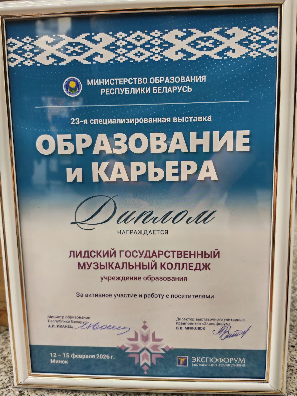 Наш музыкальный колледж награжден дипломом за активное участие и работу с посетителями 23-й специализированной выставки «Образование и карьера», который вручал первый заместитель Министра образования Республики Беларусь А.Г. Баханович.