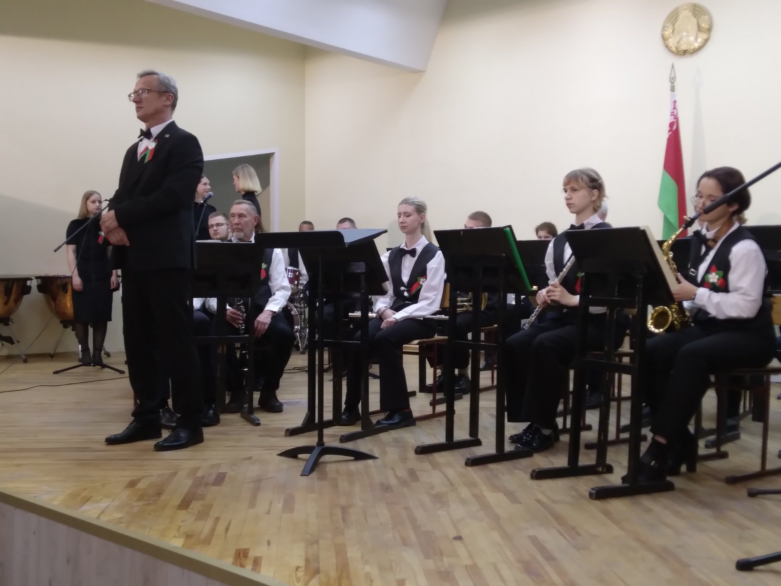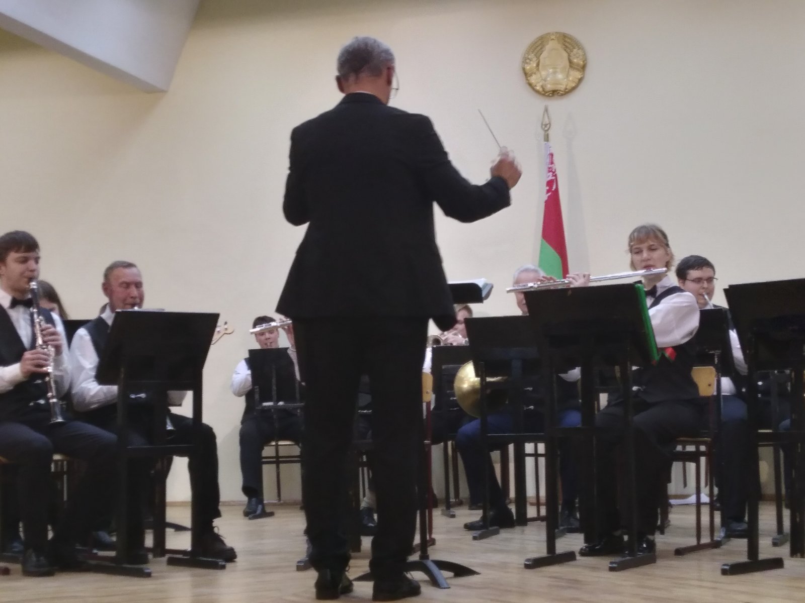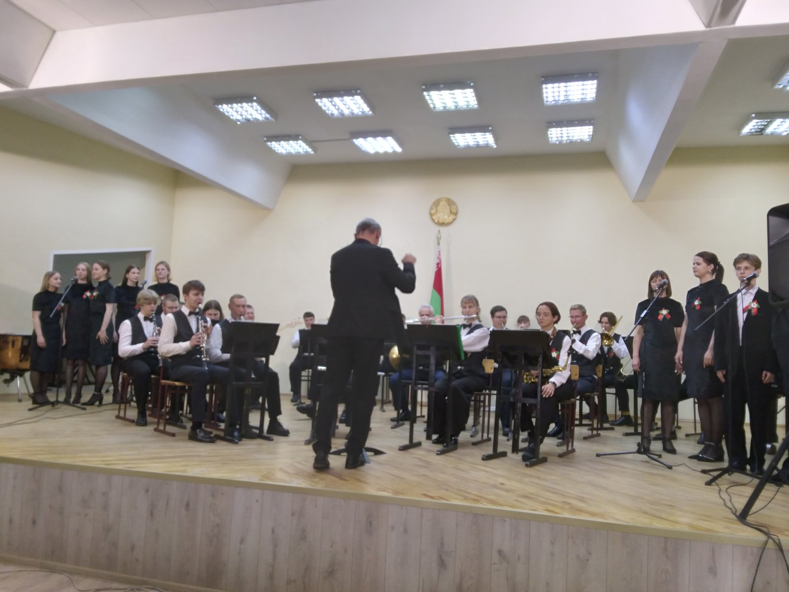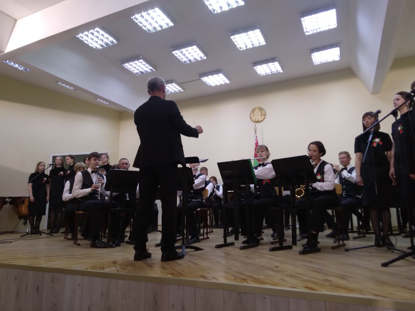 В исполнении духового оркестра, вокальной группы «Шанс», солистов -преподавателей Сергея Родиончика и Антона Бакуновича прозвучали композиции и песни военных лет, музыка к кинофильмам, сочинения советских композиторов, современных российских и белорусских авторов.