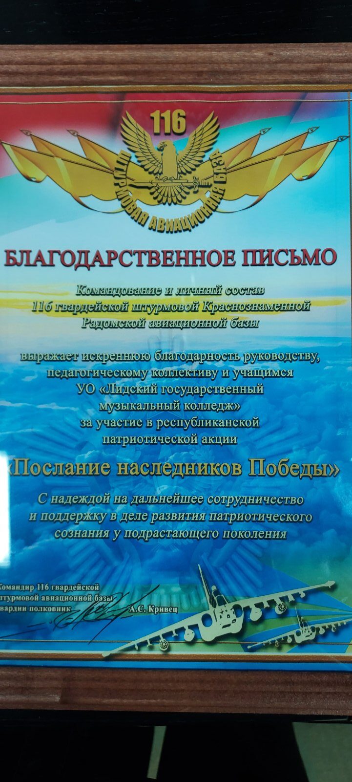 5 февраля 2025 года по инициативе Белорусского детского фонда и при поддержке Министерства образования стартовала республиканская акция » Мое письмо солдату. Духовой оркестр колледжа (руководитель и дирижер В. Бельчицкий) принял участие в концертной программе торжественного мероприятия, которое состоялось в войсковой части 19764