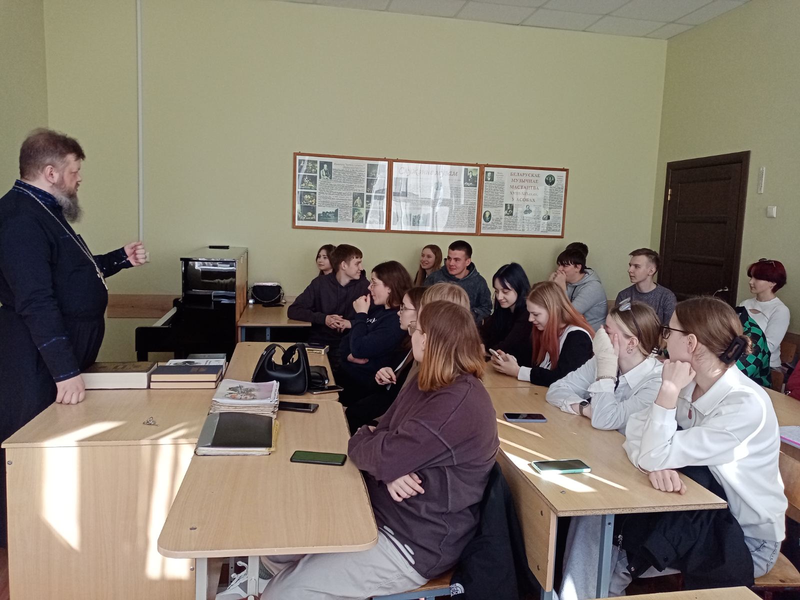 20.03.2025 В рамках книжной выставки «Свет Христов через труды святых отцов», для учащихся 3 курса состоялась встреча с иереем Леонидом.