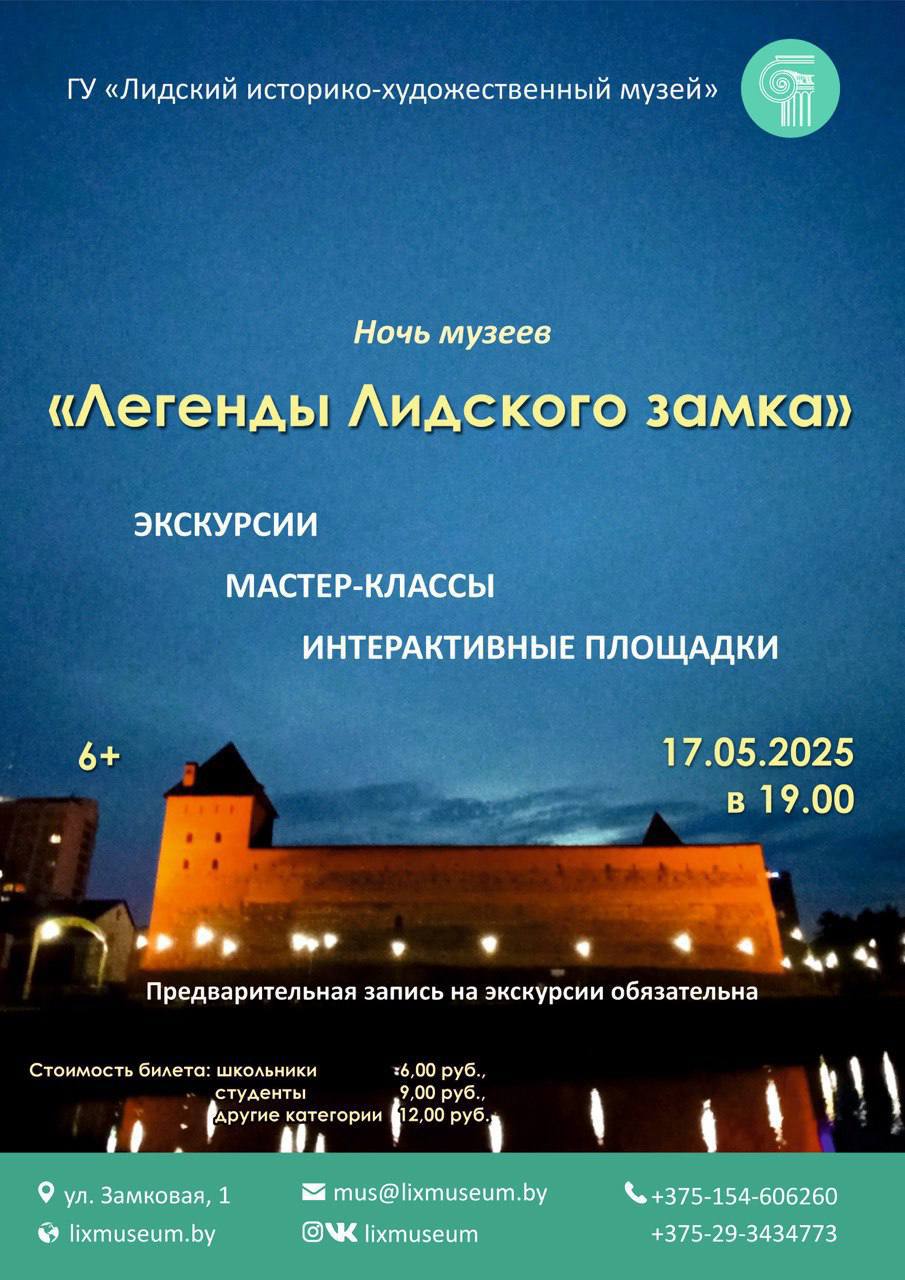 17 мая — Лидский замок, 18 мая — музей. Начало в 19:00. Интерактивные площадки, мастер-классы, экскурсии и уникальная возможность увидеть экспозиции в вечернее время
