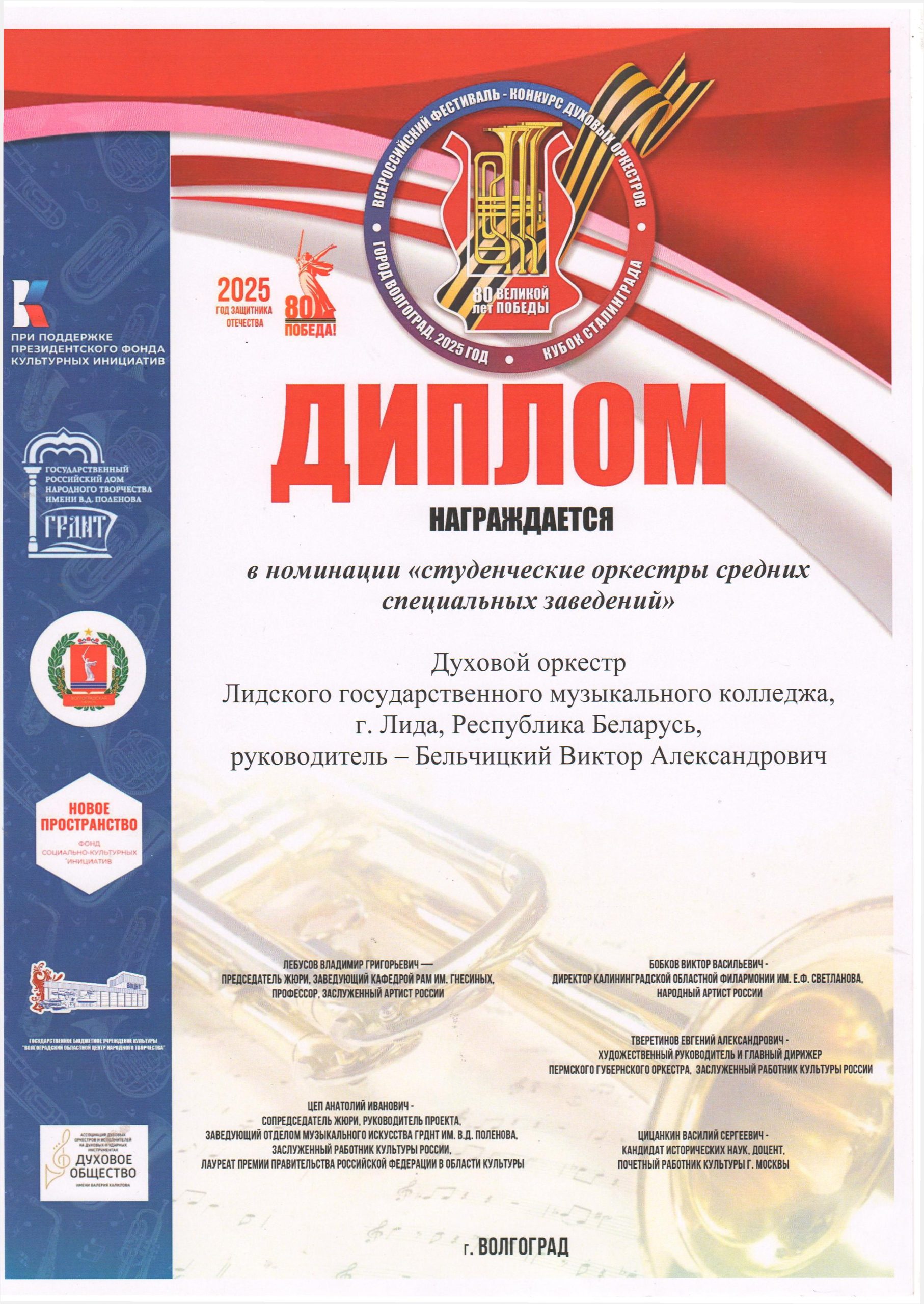 Духовой оркестр, художественный руководитель и дирижер Бельчицкий Виктор Александрович, с дипломом Всероссийского фестиваля-конкурса духовых оркестров «Кубок Сталинграда» (г. Волгоград, Российская Федерация)