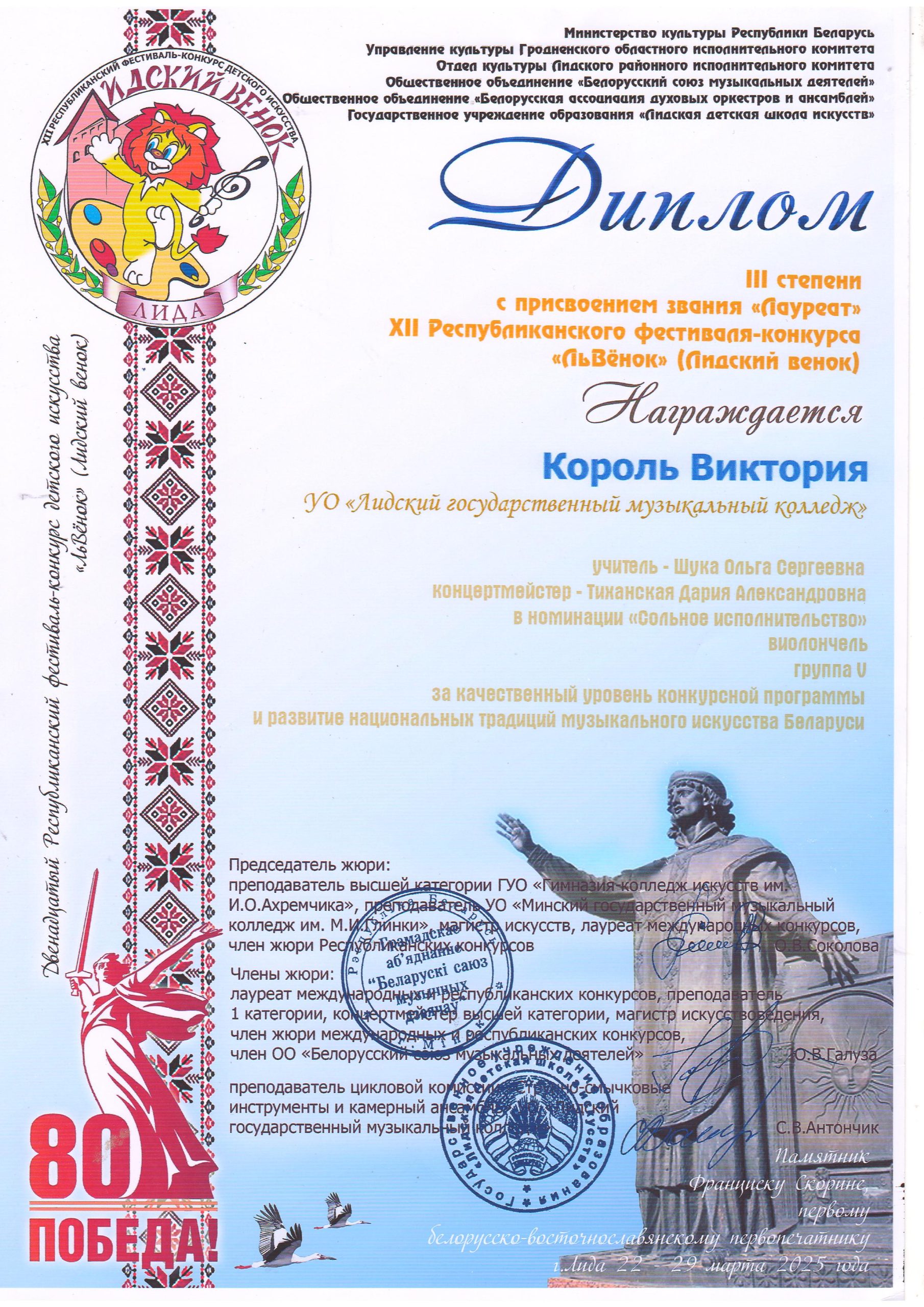 Король Викторию (преподаватель Шука Ольга Сергеевна, концертмейстер Тиханская Дария Александровна) с дипломом лауреата ІІІ степени ХІІ Республиканского фестиваля-конкурса «ЛьВёнок» (Лидский венок)