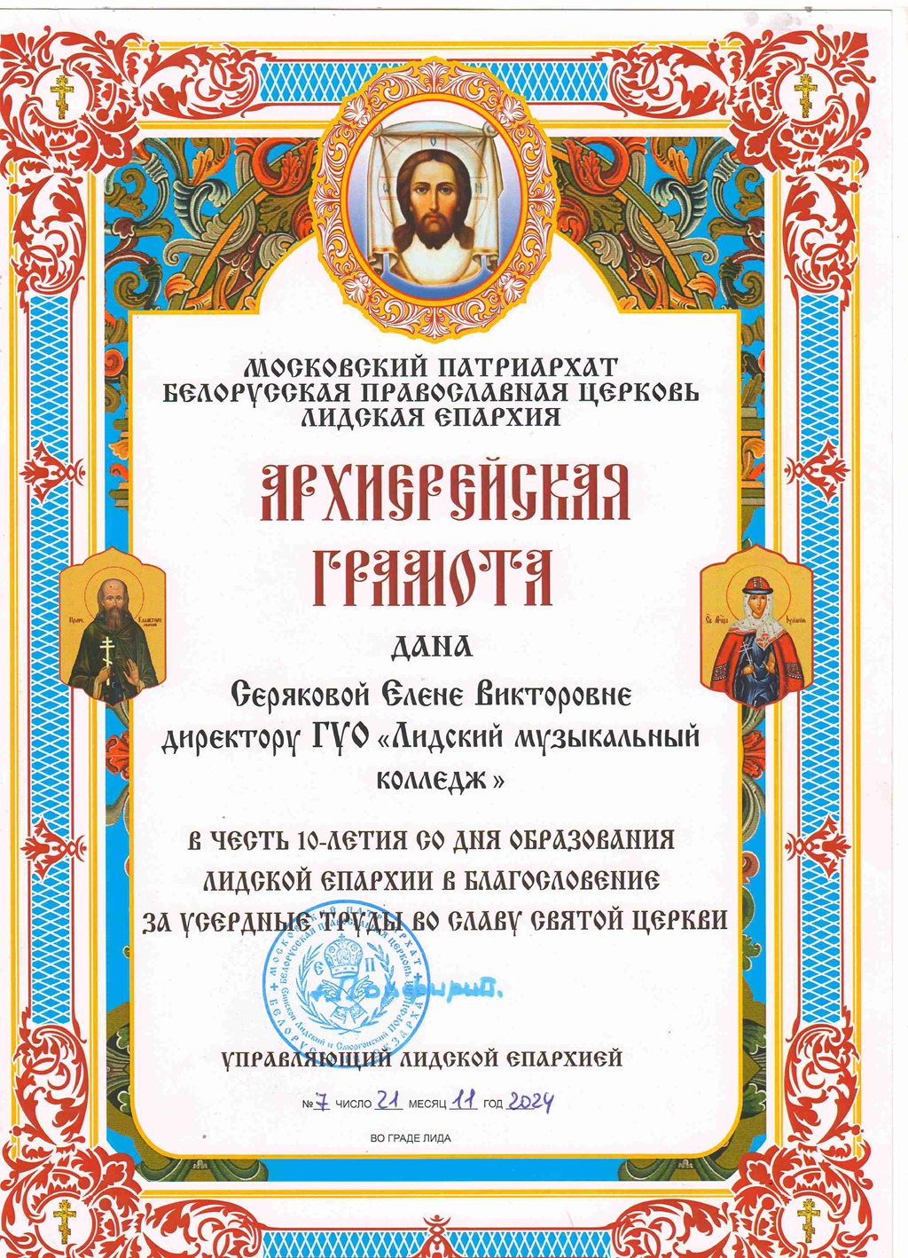 Директора колледжа Серякову Елену Викторовну с вручением Архиерейской грамоты в честь 10-летия со дня образования Лидской епархии за усердный труд во славу Святой церкви.