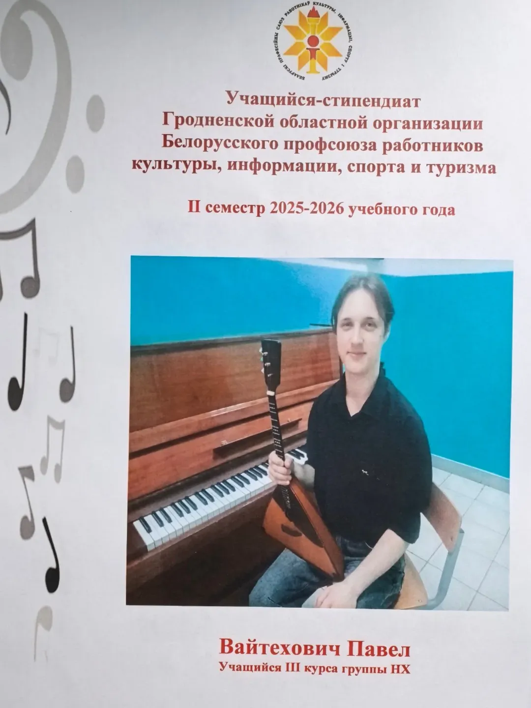 Учащегося 3 курса группы НХ Павла ВАЙТЕХОВИЧА с назначением стипендии Гродненской областной организации Белорусского профсоюза...