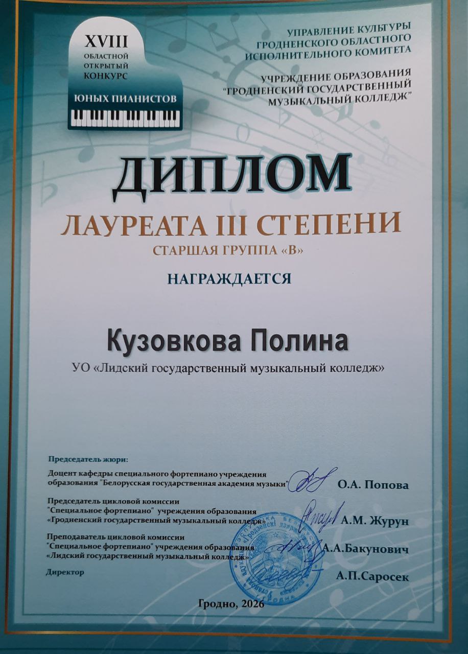 Кузовкову Полину (преподаватель Сушко Нина Николаевна) с дипломом лаурета III степени XVIII Областного открытого конкурса...