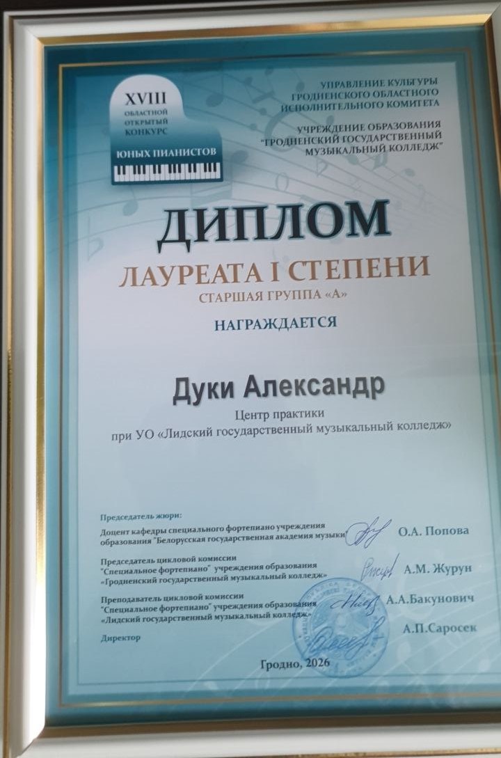 Дуки Александра, ученика центра практики при УО «Лидский государственный музыкальный колледж», (преподаватель Бакунович Антон Алексеевич)...