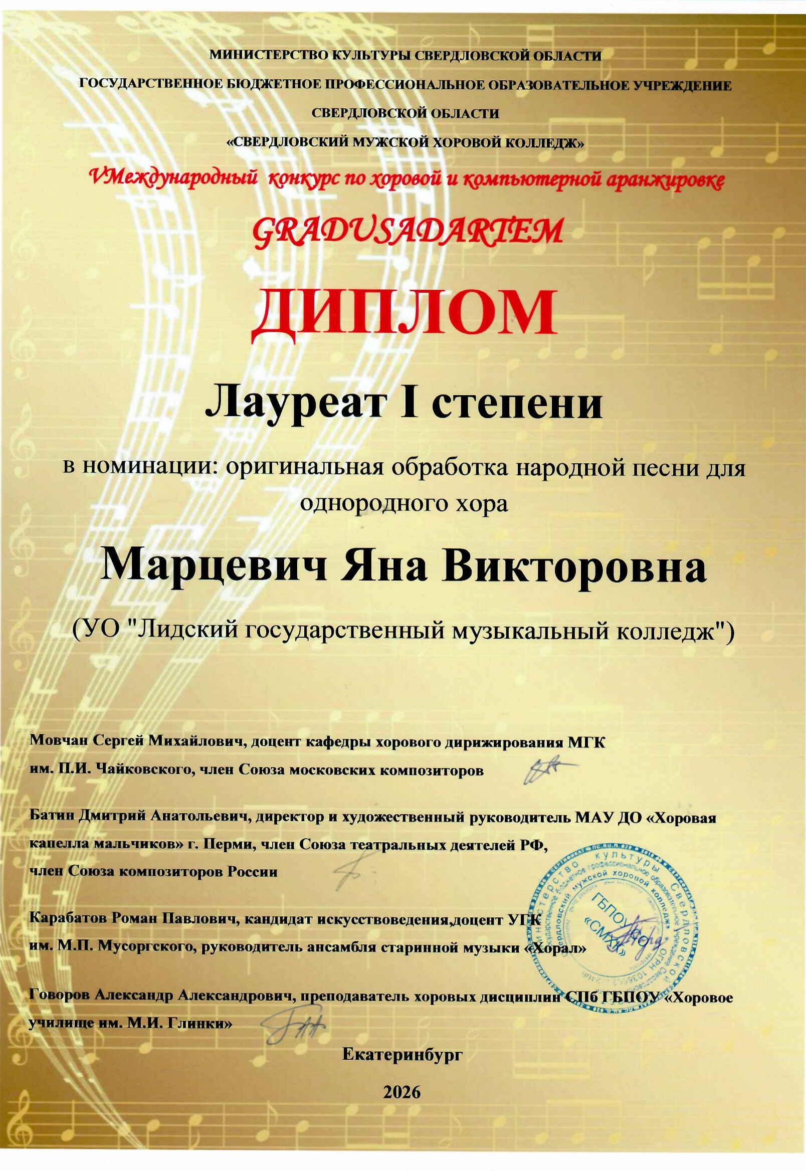 Преподавателя Марцевич Яну Викторовну с дипломом лауреата I степени V Международного конкурса по хоровой и компьютерной аранжировке...