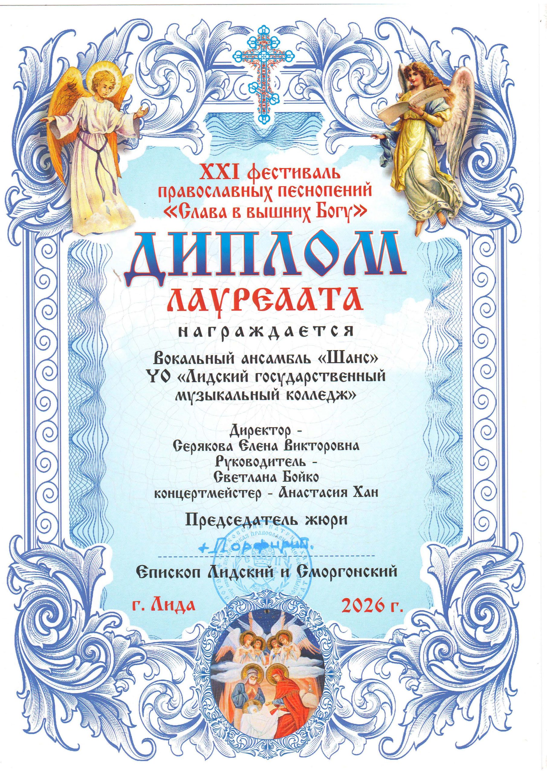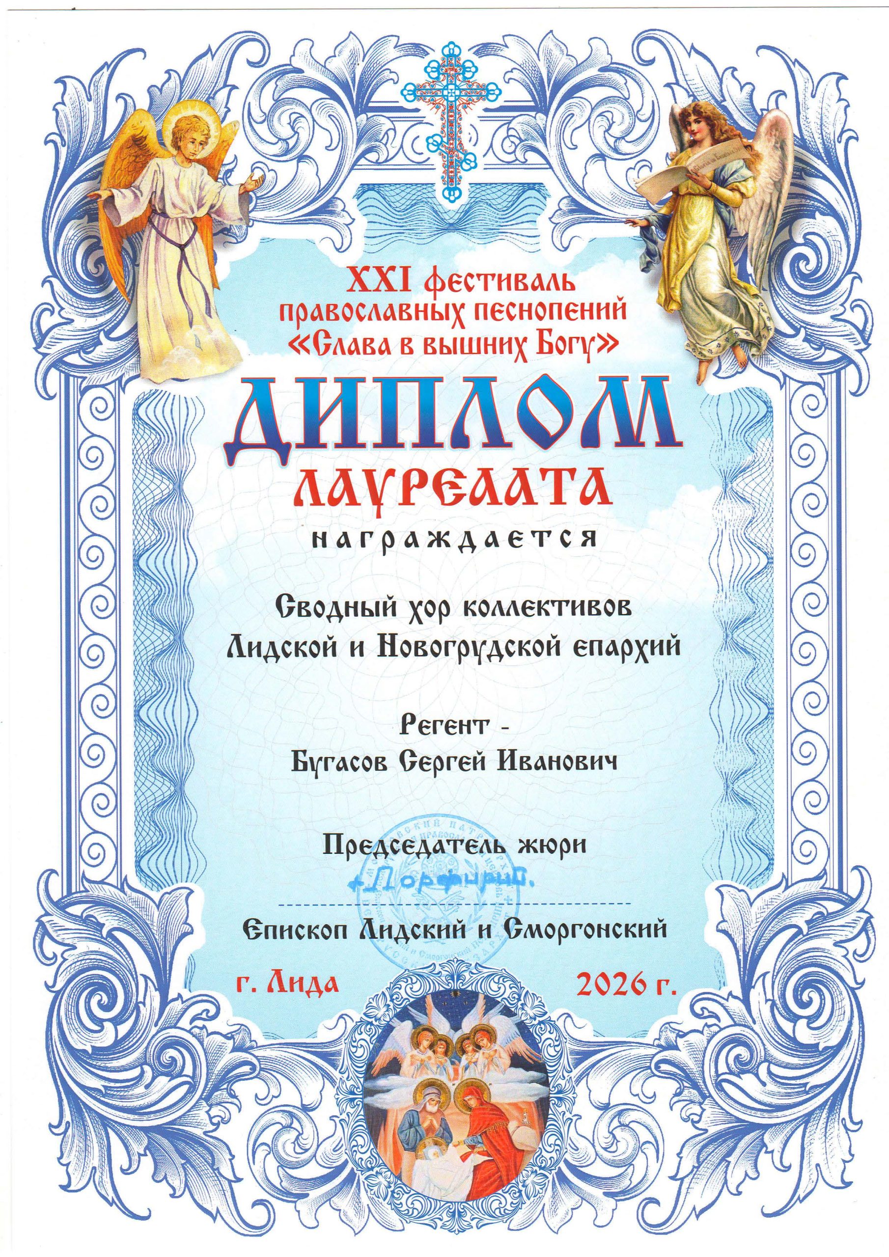 Сводный хор коллективов Лидской и Новогрудской епархий (регент, преподаватель — Бугасов Сергей Иванович) с дипломом...